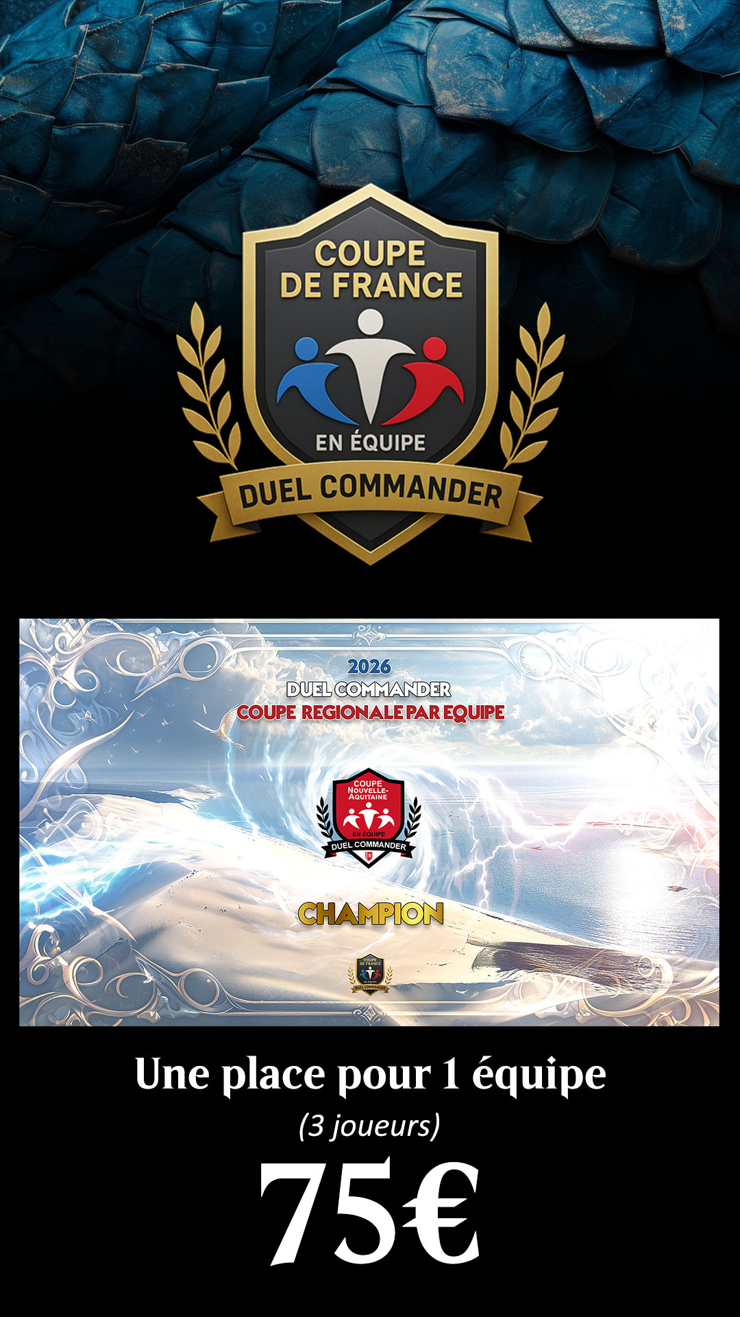Ce ticket contient une place pour une équipe complète de 3 joueurs pour le tournoi Qualificatif à la Coupe de France de Duel Commander par Equipe organisé le 8 mars 2026 à la boutique.